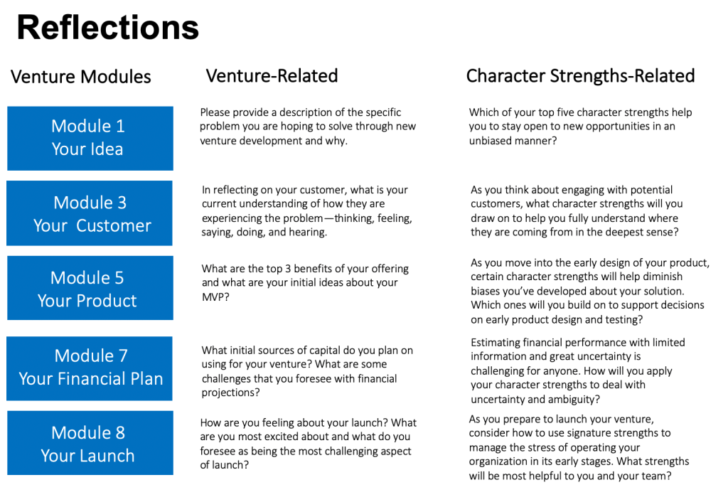 At the beginning of a course, I have the students take the VIA survey and ask them to be prepared to refer back to their basic results throughout the term. At the end of each module, students are asked to reflect on specific aspects of the venture process they are currently working on and reflect on how their strengths can be applied to support them at this stage. Their reflection responses are both discussed during in-class peer sessions and integrated into faculty feedback to support student growth as an entrepreneur. The figure below illustrates sample venture and character strength reflection questions for select modules.