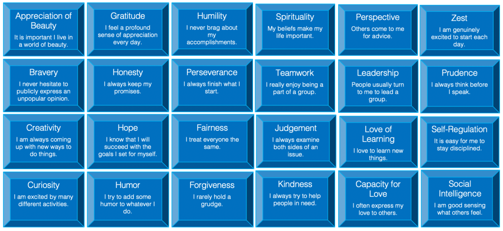 There is a great deal written about the 24 character strengths identified by the aforementioned researchers. Here is a concise image where you can easily reference each character strength with a sample survey item as we continue our discussion.