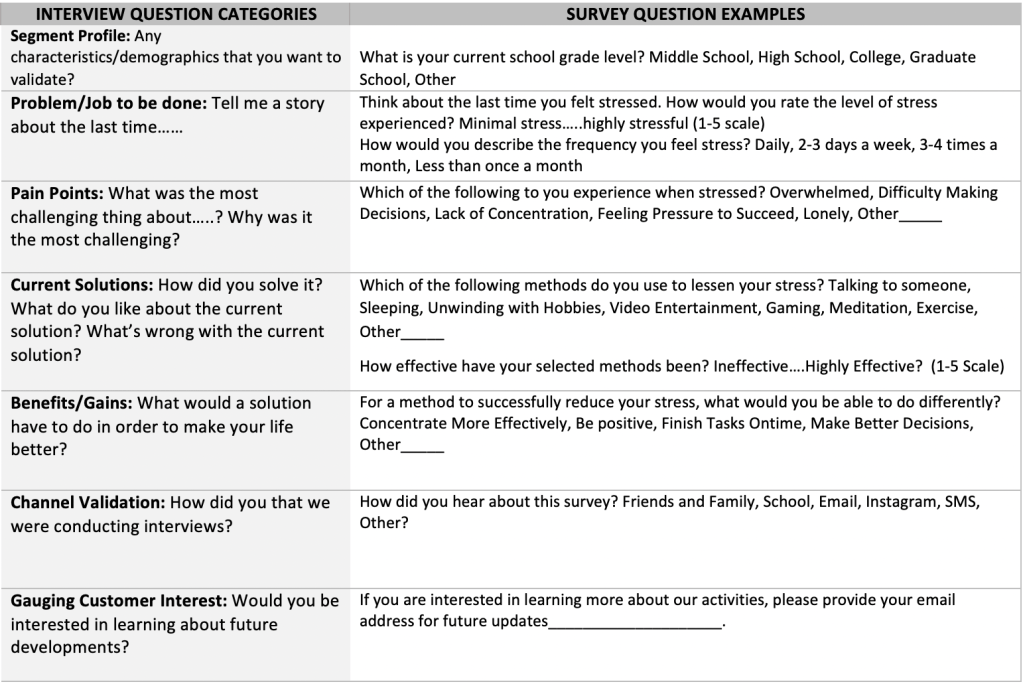 After the survey introduction, you should design your questions to solicit information about the customer’s experience with the problem, specific challenges, application of current solutions, and desired outcomes. As noted, you can follow a similar script as you use in an interview, except the questions are now designed to solicit quantifiable responses. See the table below for some examples.