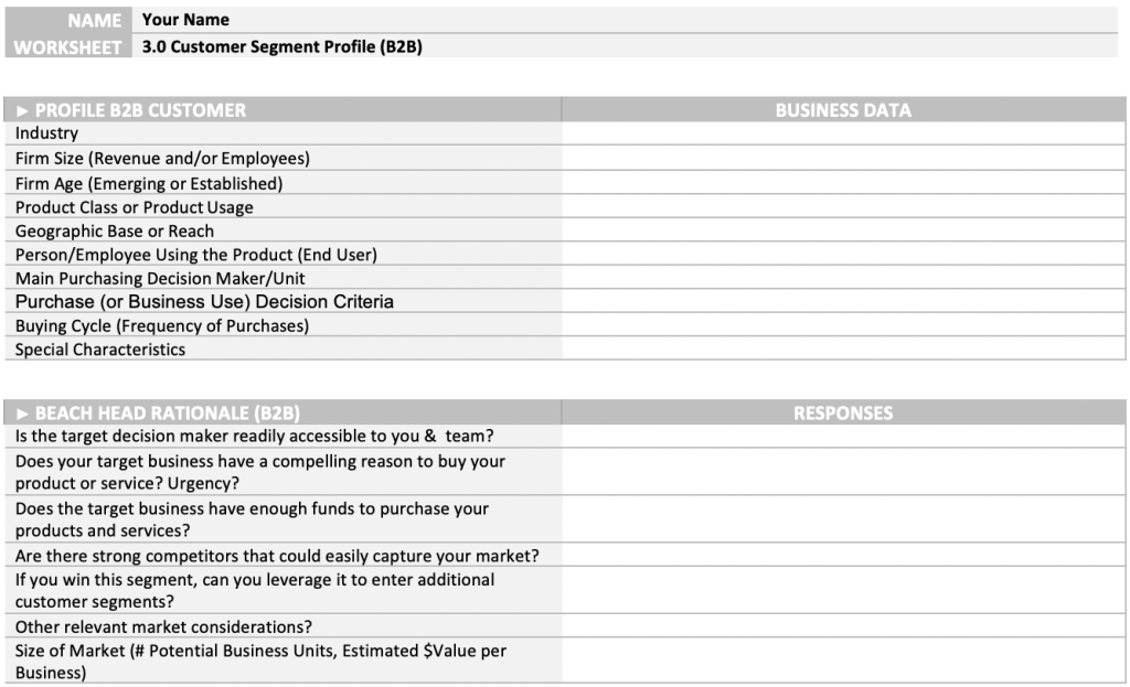 Defining customer profiles helps you to identify how you will best reach and engage your target customer. Start with your top priority customer segment, otherwise known as your “Beach Head.”