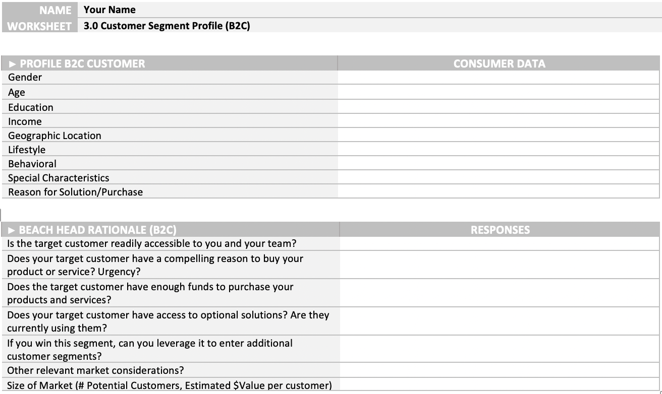 In the early stages, you should brainstorm numerous potential market segments for your venture concept. Once you have done so, focus your selections on the top three or the most exciting market opportunities. Based on your customer profile efforts, you should review each segment in terms of the assumptions mentioned above. Through your market research and customer discovery process, you will be able to answer the following questions to help prioritize your selection.