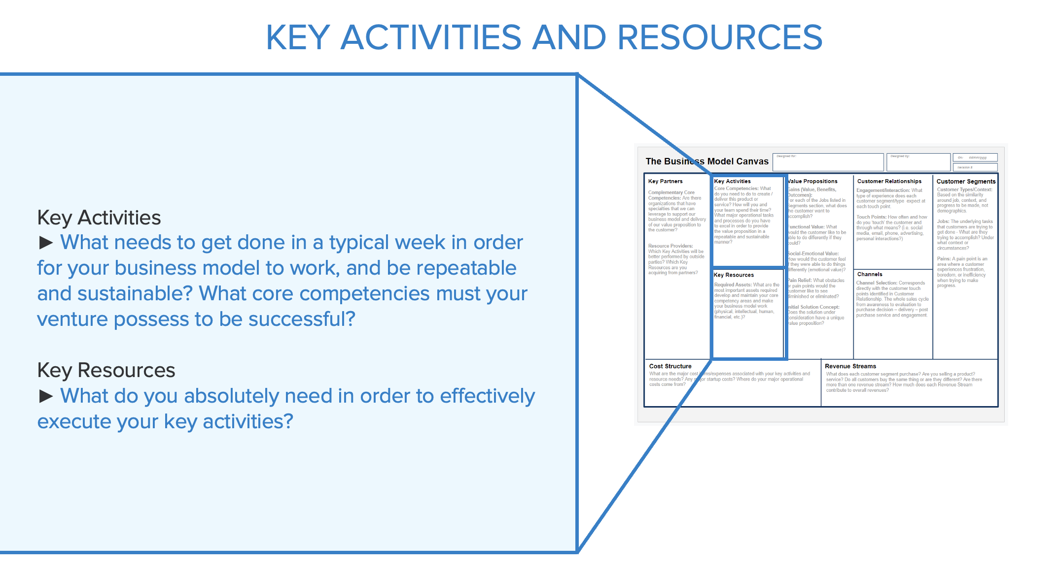 On the left side of the business model canvas, you have three elements that address what Key Activities, Key Resources, and Key Partnerships are essential to delivering your solution to the customer. This section of the business model canvas refers to the infrastructure of your enterprise.