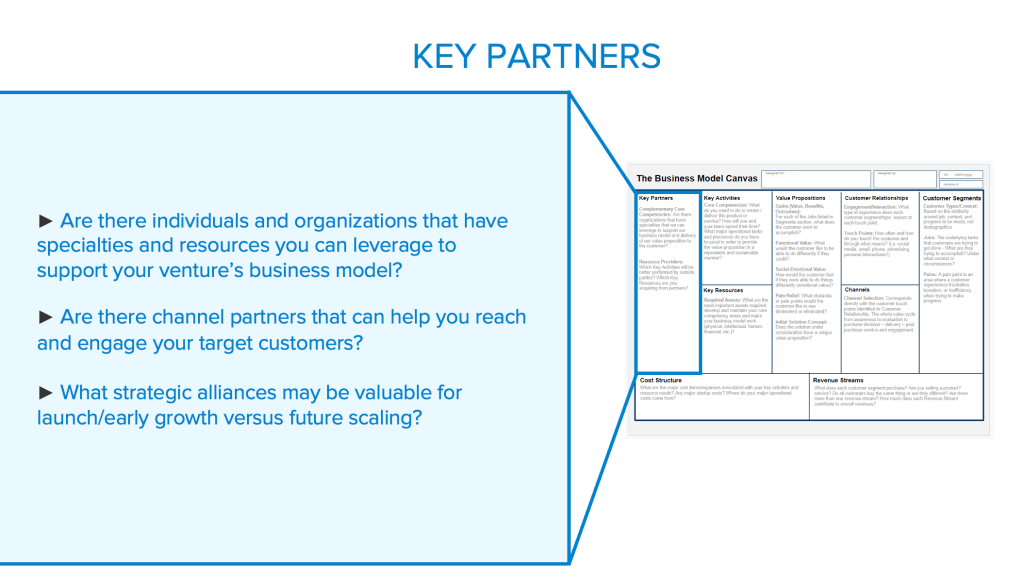 Key Partnerships are those strategic relationships necessary to execute your business model. These types of non-customer relationships are critical for startups, as they can help lower operational costs, expand distribution channels, or help achieve competitive advantage. These strategic partnerships can be with manufacturers, suppliers, distributors, trade associations, regulatory agencies, competitors, and technology providers.