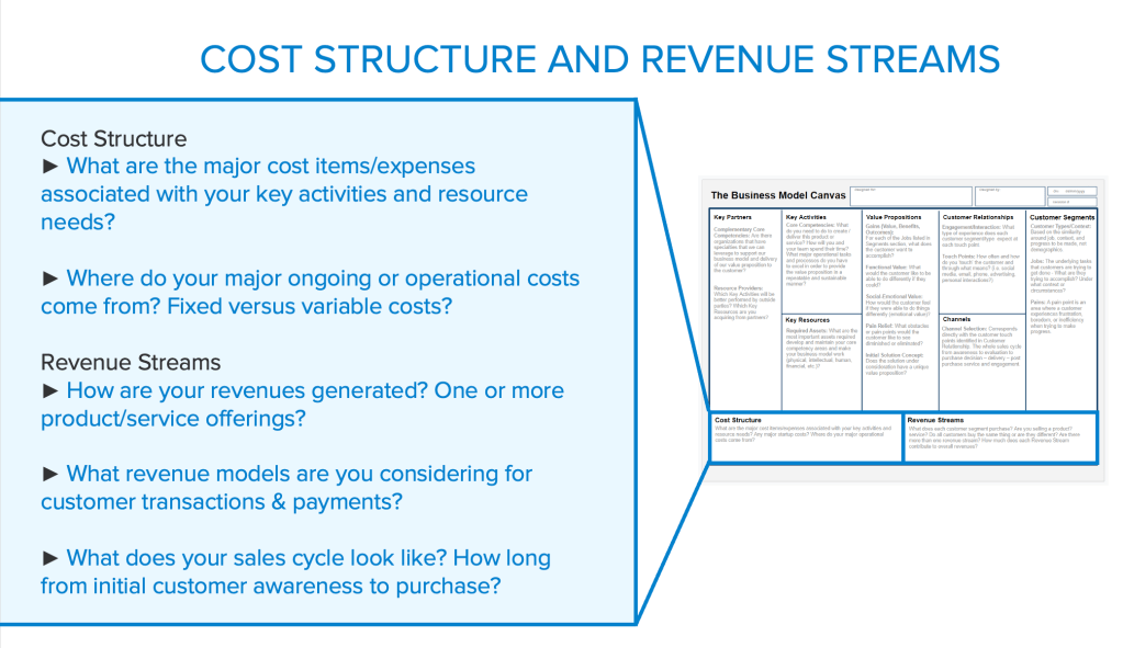 Cost Structure refers to the main costs incurred while running your business. At this point, you should be identifying the high percentage costs, those related to the core activities and resource requirements. These expenditures can include fixed asset and variable expenses and any high overhead costs that you anticipate to support the business model. Your cost structure must meet the operational requirements to execute your business model but be consistent with the projected revenues to emanate from your customer segments. Of course, if the costs are more than the revenues, you will need to revisit various business model elements.