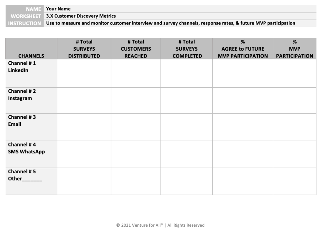 I typically have founders create a table listing all the access channels to send surveys out to customers. Next, founders list how many customers they plan to reach each channel. With these numbers as a base, you can collect data on the number of surveys viewed, percentages of customer respondents, and of those the number who state interest in participating in future solution tests. Later on, founders can measure how many of these early customers participate in minimum viable product tests to measure continued interest. In effect, you now have some early sales funnel data that you can apply to early financial projections and post-launch benchmarks.