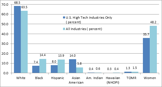IDEO was very much part of the Silicon Valley environment. If you zoom on Silicon Valley, gender and ethnicity representation was woeful. In a 2014 U.S. Equal Employment Opportunity Commission special report, investigators looked at the participation rates by gender and race, comparing the tech industry with all U.S. industries, emphasizing Silicon Valley. Overall participation rates of whites, Asian Americans, and males in U.S. high tech industries were disproportionally higher, especially in the Silicon Valley geographic area. African Americans and Hispanics were under-represented nationwide in the high-tech sector compared with the private sector. African Americans and Hispanics were significantly under-represented in the high-tech industry in the Silicon Valley geographic area. Additionally, women lagged behind men in leadership positions and technology jobs, as Technicians and Professionals, in the high tech sector. These gender differences were predominantly evident in the high-tech industry of Santa Clara County.