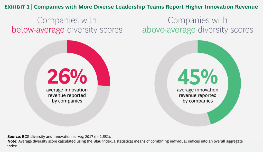 As has been the case for many years, it is challenging to find studies directly measuring innovation performance. One of the best innovation performance measures identified in my earlier studies was the revenue or profitability generated from new products over three years. 3M was the first company to popularize this innovation metric. Many firms have since adopted it over the past couple of decades. A 2018 BCG report investigated the relationship between diverse leadership teams and this innovation metric. BCG found a strong and statistically significant correlation between the diversity of management teams and overall innovation revenue. Companies that reported above-average diversity on their management teams also reported innovation revenue that was 19 percentage points higher than that of companies with below-average leadership diversity—45% of total revenue versus just 26%.