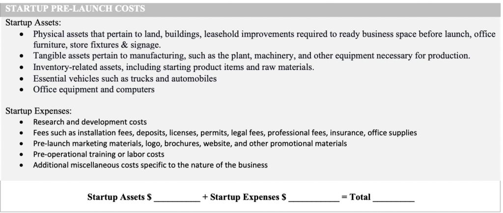 Startup costs are expenses incurred before you officially launch your business for revenue generation. In my experience, most founders underestimate the potential resources required to build a business plan and prepare for subsequent market entry. Every company will have its own unique set of requirements to prepare for market entry. Ventures that require physical assets such as brick and mortar locations, large starting inventories, or extensive research and development activities will face significant resource needs and associated expenditures. Other ventures can navigate the pre-launch phase with minimal costs. In either case, planning for financial needs pre-launch facilitates a vital leadership discipline that serves founders well throughout the journey.