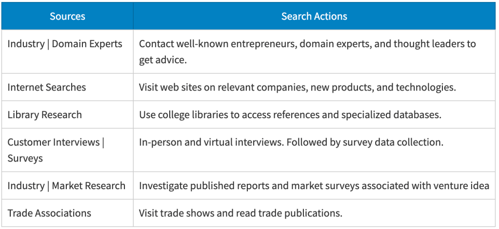 Within the venture realization process, entrepreneurs search for information surrounding an opportunity from various sources. The entrepreneur must find answers to the critical questions about a potential venture idea. Data collection can come from a variety of sources. See the table below. In one sense, the more sources consulted, the more valid the results. However, one can overdo it; the amount of available data can become overwhelming. This availability of information is both an advantage and a challenge.