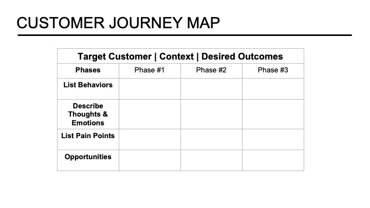 To compliment your customer persona, I suggest including what I call a pre-solution journey map. Visualizing what your customer is currently experiencing before your solution’s existence highlights their pain points in the current marketplace. In addition, mapping their journey adds clarity to your target customer’s needs and desired outcomes, thus providing additional clarity to all stakeholders.