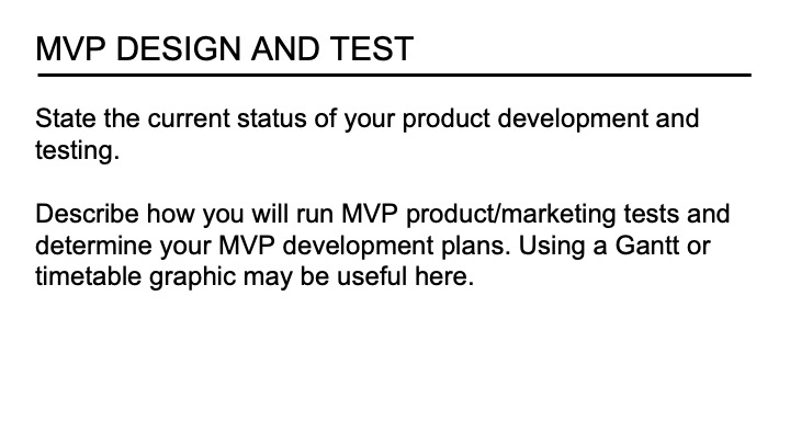In this final slide, founders can offer information about important goals and associated milestones relative to the the current period. These milestones relate to major strategies and actions critical to the venture’s stage of development. The focus may be on product development testing iterations or steps towards market entry and early traction. If providing this information to investors, it may include funding rounds integrated with growth milestones.