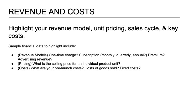 - Financial Upshot- How many people will buy it in the first and second years?; How much will it cost to design and build the product?; What is the sales price?; How much investment are you seeking?