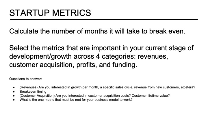 Startup Metrics. Demonstrating to stakeholders that you are focused on specific results and are measurement driven is a positive set of founder attributes. As I have written earlier, founders need to monitor many potential metrics or key performance indices (KPIs). What to measure depends on the stage of your venture’s development. While the key metrics change as your venture evolves, there are four performance areas related significantly to your business model: customer engagement metrics, MVP metrics, profit model metrics, and resource acquisition metrics. Additionally, founders should identify one or two critical metrics that must meet certain levels for their business model to be viable. For the reading deck, consider the essential metrics for your stage of development and highlight that one metric that matters!