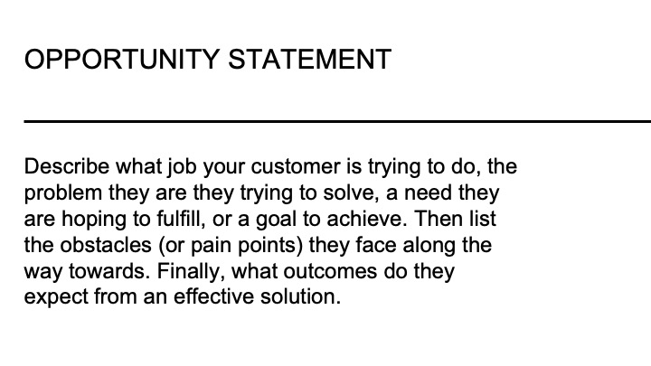 The “reading” deck has replaced the more traditional narrative-based business plan document. This change might seem like less work, but it takes a reasonable amount of time to create a concise version of your business model and structure it in a way that tells your story effectively. I find it helpful to use a structured framework to support the development of this reading deck. When advising founders, we go through the eight modules of the new venture realization roadmap. Each module aligns well with the essential elements of a startup business plan. Modules 1-2 provide the starting point where founders describe the opportunity they are hoping to capitalize on with their venture.