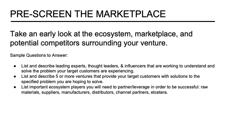 Another slide to add to the opportunity section allows the founder to document early pre-screening of the marketplace. I find that many new entrepreneurs come into an idea with minimal understanding of the dynamics of the industry and associated ecosystem. What are the major industry trends? Is it growing, segmenting, or declining? Who are the leading domain experts, thought leaders, and influencers? Who should you be following on social media, reading their writings, and potentially connecting with them at some point in the venture’s development? Finally, founders should take an early survey of the competing solutions in the marketplace. This information helps founders to evaluate the market’s attractiveness and the nature of the current activity to solve the customers’ needs.