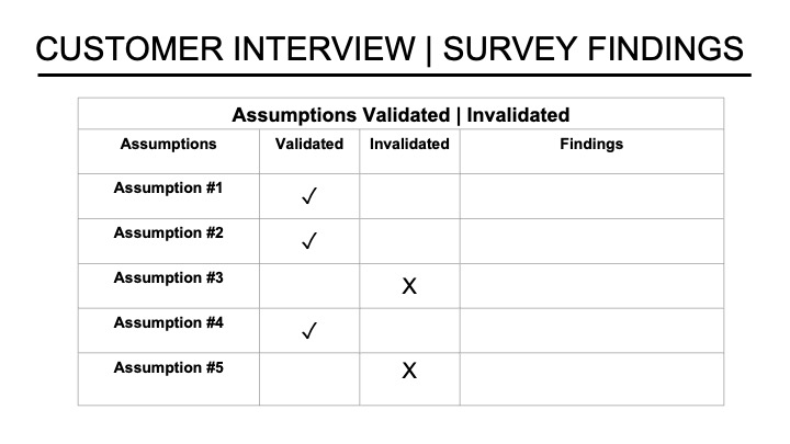 A final slide in this section focuses on what you have learned from your customer discovery interviews and surveys. Here, you should include the number of customers involved and any relevant target demographic data. The slide should highlight critical findings that validate or invalidate your early assumptions about the target customer, the presenting opportunity, pain points, and desired outcomes. You can list your assumptions and then provide an ✓or X validation status.