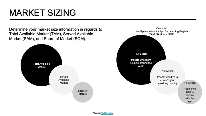 Market Opportunity: The marketing section must establish a demand or need for the product or service and define both the market and the potential opportunity. Many founders apply a framework that defines the total available market (TAM), served available market (SAM), and share of the market (SOM). I recommend conducting a bottoms-up analysis on your target customer (beachhead) only. In this scenario, the TAM estimates how many target customers, as defined by your profile, exist within your geographic boundary. SAM further delineates your market by customers actively searching for a solution to said problem. Finally, SOM provides an early estimate as to how many of those SAM customers you can reach and acquire in the first 1-3 years of operation. You refine your SOM estimations once you have a customer acquisition strategy and understand any operational constraints.