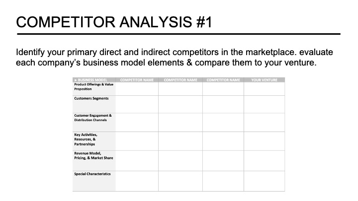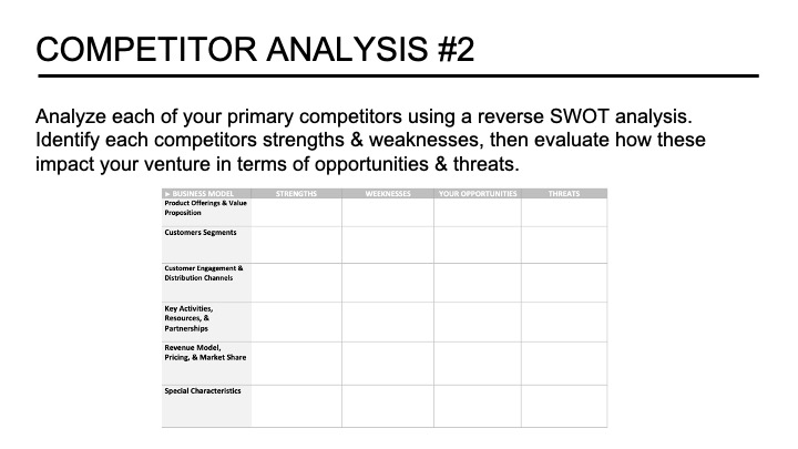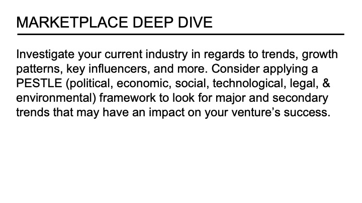 Another slide to add to the opportunity section allows the founder to document early pre-screening of the marketplace. I find that many new entrepreneurs come into an idea with minimal understanding of the dynamics of the industry and associated ecosystem. What are the major industry trends? Is it growing, segmenting, or declining? Who are the leading domain experts, thought leaders, and influencers? Who should you be following on social media, reading their writings, and potentially connecting with them at some point in the venture’s development? Finally, founders should take an early survey of the competing solutions in the marketplace. This information helps founders to evaluate the market’s attractiveness and the nature of the current activity to solve the customers’ needs.