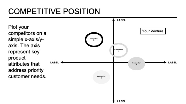 One way to illustrate the current competitive landscape and your strategy to enter the market is through what is called a positioning graph. Typically, founders select essential product attributes that address vital customer concerns. The rationale for choosing said attributes is that the founder believes the selected characteristics set them apart from the competition.