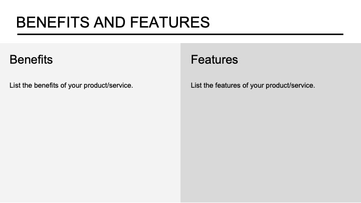 - Benefits & Features: The entrepreneur should comment on the nature of the product or the service’s various uses and what constitutes its appeal. This section is an opportunity to emphasize the unique features of the product or service and the value proposition to customers, thereby establishing the business’s potential.