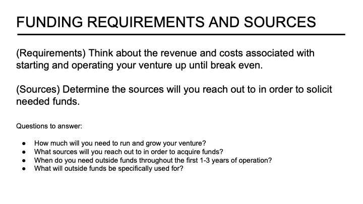 Fundraising Requirements. The funding section of the reading deck should describe how much money is required to finance the business, the uses of the funds, and when they will be needed. To determine financing requirements, entrepreneurs must evaluate and estimate the funds required for (but not limited to) research and development, purchases of equipment and assets, and working capital. For example, to finance the research and development of a product, entrepreneurs might experience a long delay between incurring research expenses and generating sales. Thus, it may be appropriate to fund these expenses with long-term financing. The content in this slide coincides with financial data noted in earlier slides and the financial statements in the appendix.