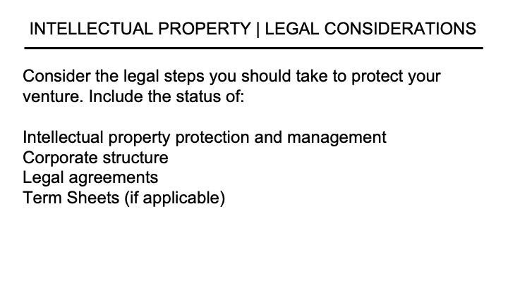 Startups have several legal issues to address in the early stages of their development and before they launch into the marketplace. For the reading deck, there are a few things to highlight. First, you can list any intellectual property you own. These assets include patents, trademarks, and copyrighted materials. Confirm that all intellectual property is legally assigned to the venture and that proper employee agreements are in place to continue said assignments. Secondly, you can state what form your corporate structure takes and in what state. Finally, highlight any other founder, employee, or investor agreements you have in place currently.