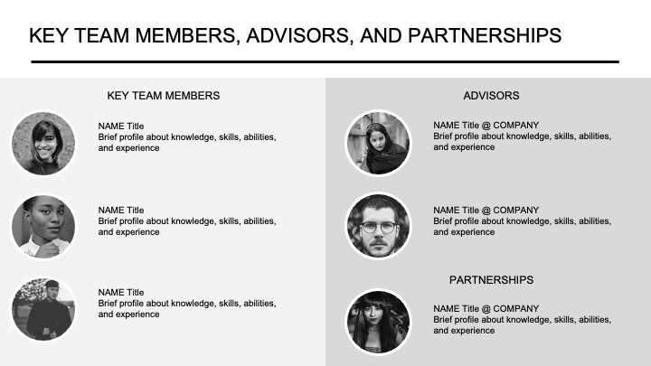 The startup team’s talents and skills should be detailed in the this section of the reading deck. If the business plan is being used to attract investors, this section should emphasize the team’s talents and indicate why this management will help the company have a distinctive competitive advantage. Entrepreneurs should keep in mind that individuals invest in people, not ideas. Detail the expertise, skills, and related work experience of the proposed founding team and the backgrounds of those individuals who are expected to play key roles in the venture. These include investors, members of the board of directors, key employees, advisers, and strategic partners.