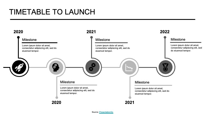 In this final slide, founders can offer information about important goals and associated milestones relative to the the current period. These milestones relate to major strategies and actions critical to the venture’s stage of development. The focus may be on product development testing iterations or steps towards market entry and early traction. If providing this information to investors, it may include funding rounds integrated with growth milestones.