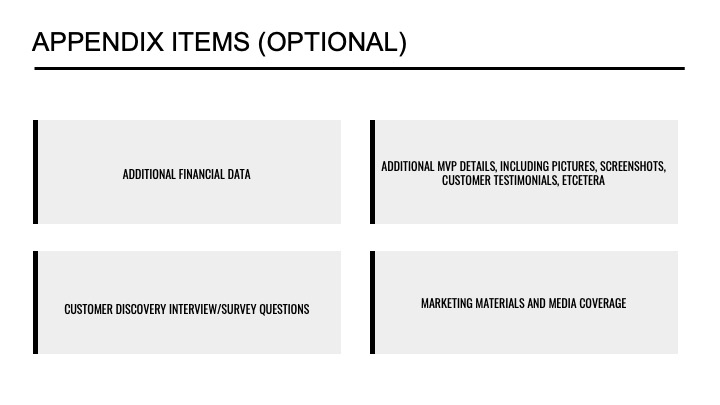 Founders can include several items in the reading deck appendix. Standard items include financial statements, customer research data, product development (MVP) documents, and sample marketing and branding materials.