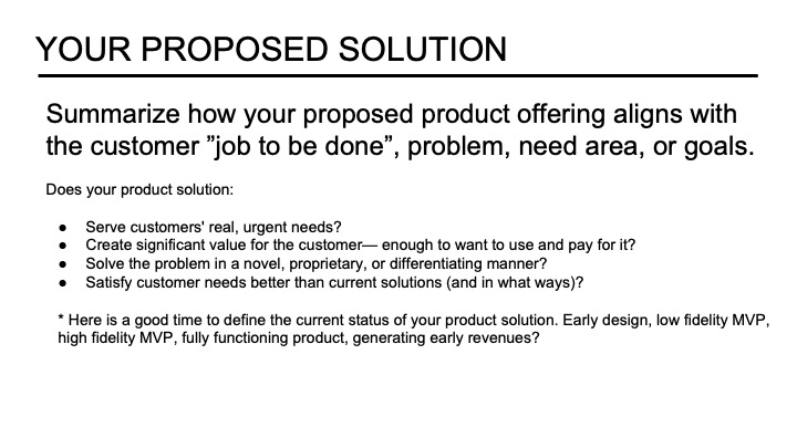 Additionally, they can use the business model canvas as an integral part of the planning document, weaving the nine elements throughout the plan’s sections. Modules 3-4 focus on extensive customer discovery and marketplace analysis, covering what you know about customer needs, the number of customers looking for a solution, existing solutions out in the market, and other significant marketplace trends and stakeholders. Module 5 provides the opportunity to describe the status of your product’s development and testing with customers. Module 6 guides you through customer acquisition and branding strategies. Module 7 is all about finance, helping founders to step through the process of building credible financial projections and identifying critical metrics in the current stage of their startup’s development. Finally, Module 8 highlights key operational and human resource management vital to execution and startup launch. With this in mind, let’s review the main components of a business plan reading deck.